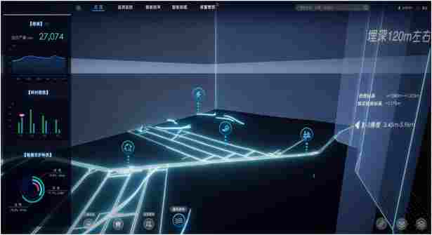 基于GIS地理信息系统及数字孪?技术,对矿区环境、地形、矿区边界、路网、水系、绿地、地面建筑、地下巷道等各要素态势进行数字映射,并可结合前端智能感知设备数据和专业模型算法,对安监生产、综合集控、智能巡检、决策指挥、经营管理等各领域业务数据进行综合监测分析,对各类异常事件进行可视化预警告警,并支持查看任意管理要素运行态势,助力管理者实时掌握矿井整体运行态势,为管理者提供数据支持及决策依据。